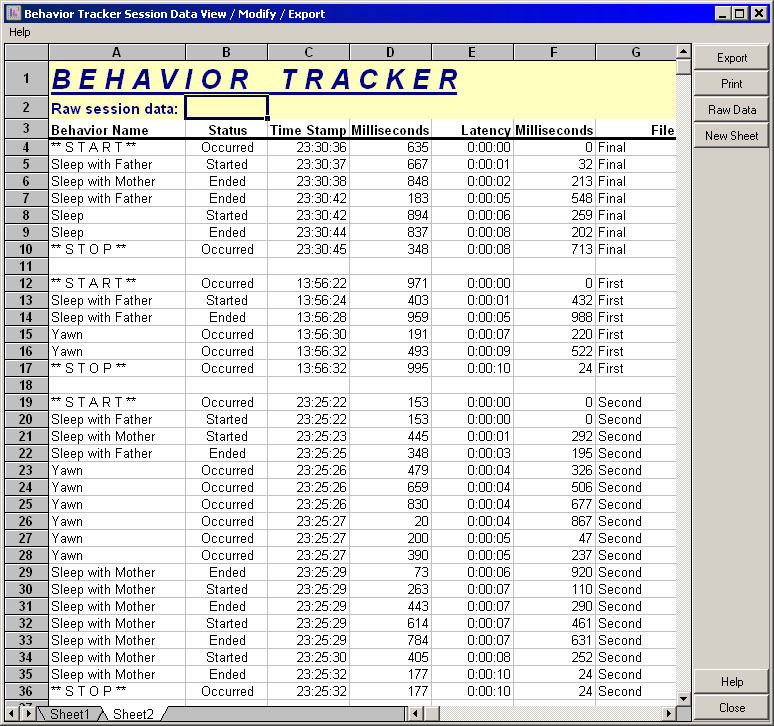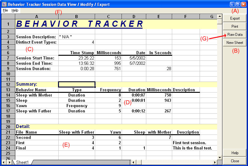 The worksheet window appears by clicking on the "Session Data View / Export" in the Viewer. Here you have a chance to look at your compiled and raw data in a spread-sheet format. Feel free to update or delete any information on this page or add formulas. Anything you change will only be saved with your export or affect the printouts you make from this form. The information will not be saved back into Behavior Tracker.